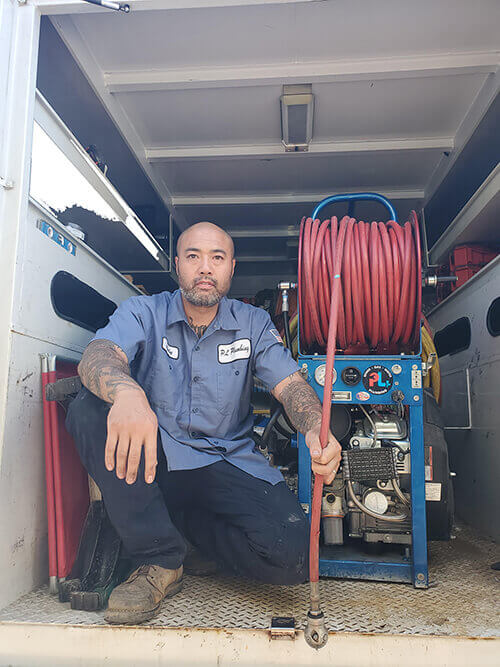 Custom built and assembled in California. 300 feet of 3/8″ piranha sewer jetting hose. 23 HP Motor. Stainless steel frame, reel, and fittings. Includes nozzles.
